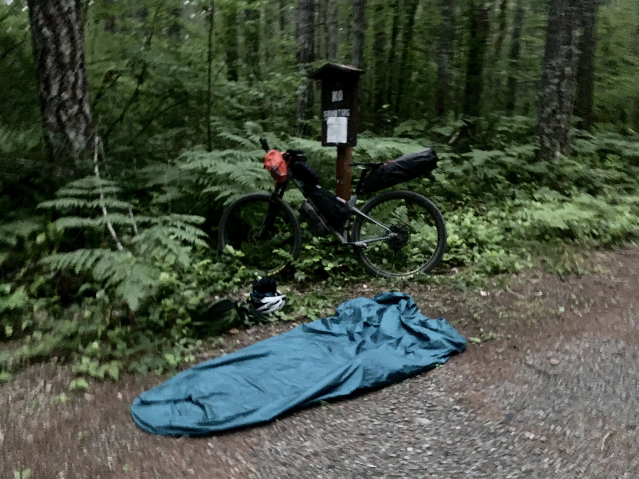 No thanks to my Wahoo, I was fairly confident that I managed to bike more than 100 miles that day, so I was ready to find a safe place to sleep. I needed to be able to use my phone to make a phone call first thing in the morning, so I needed to stay close to Forks for cell service. Once I turned on the Sitcom-Sol Duc road, the trees, shrubs, and forest undergrowth once again created a wet wall next to the road. There were a few pullouts and gated dirt roads that I stopped to check out but either they were too close to the road or full of garbage. Finally, I walked past a gate and felt that it would be unlikely for anyone to find me here. The road was not flat, but I planned to stuff some clothes under my sleeping pad to make a level sleeping spot.