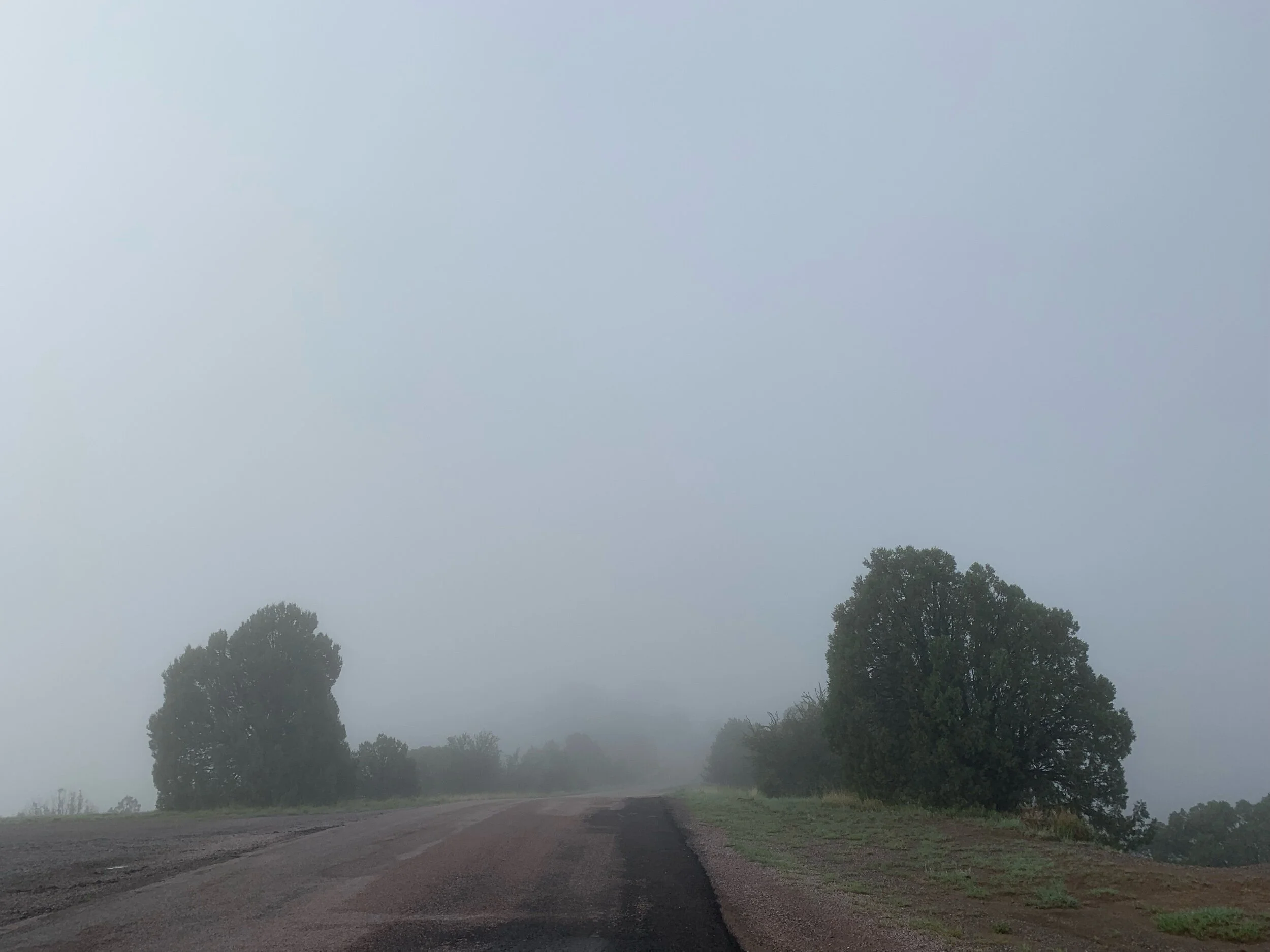There was a thick fog hanging over the Gila Forest, that formed droplets on our eye lids. We continued to climb in the fog and popped out into the sunshine that was trying to break through a couple of times. We are getting to the end of our big climbing days and today may have been the last one. We rode through the historic Pinos Altos, now in the sun and got another Continental Divide Crossing. The downhill took us into Silver City and we were relieved to be back in civilization after three days and dry for a change.
